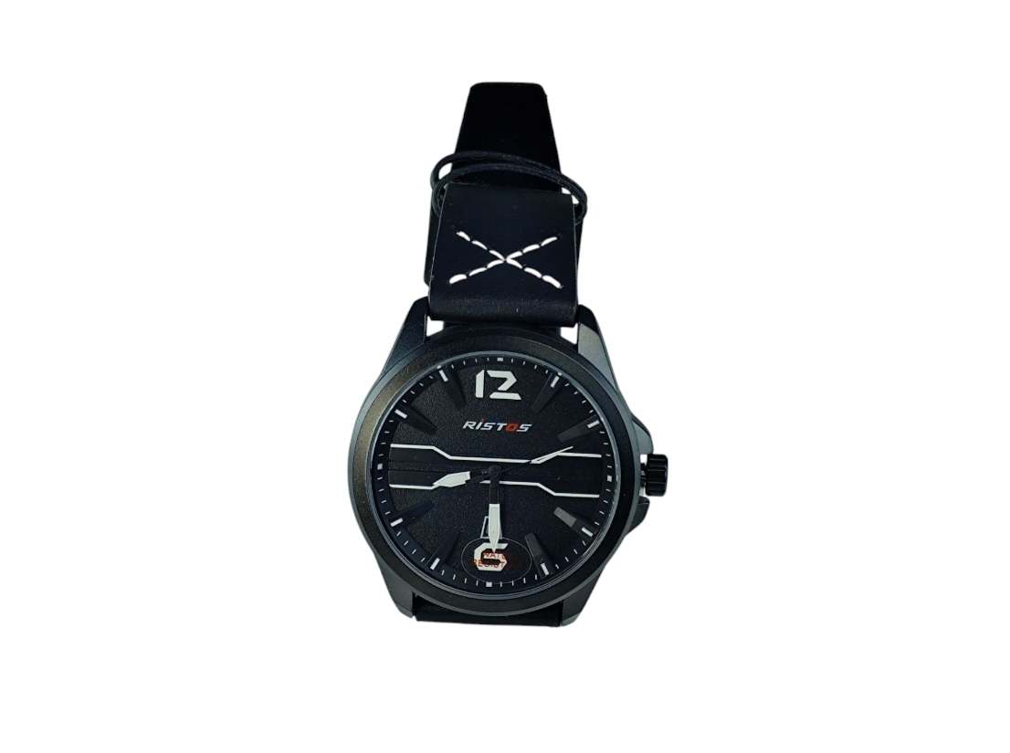 - Cadran noir élégant associé à un bracelet en cuir gris pour un contraste moderne.